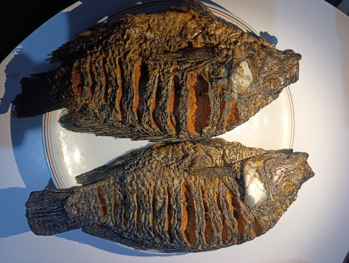 Two golden-brown fried fish are presented on a white plate with a thin blue and orange rim. The fish appear crispy, with visible scoring marks revealing an orange hue beneath the surface. The heads are intact, each with a small white spot near the gill area. The tails and fins are darkened from frying, creating a slight contrast to the rest of the body. The arrangement is simple and highlights the food.