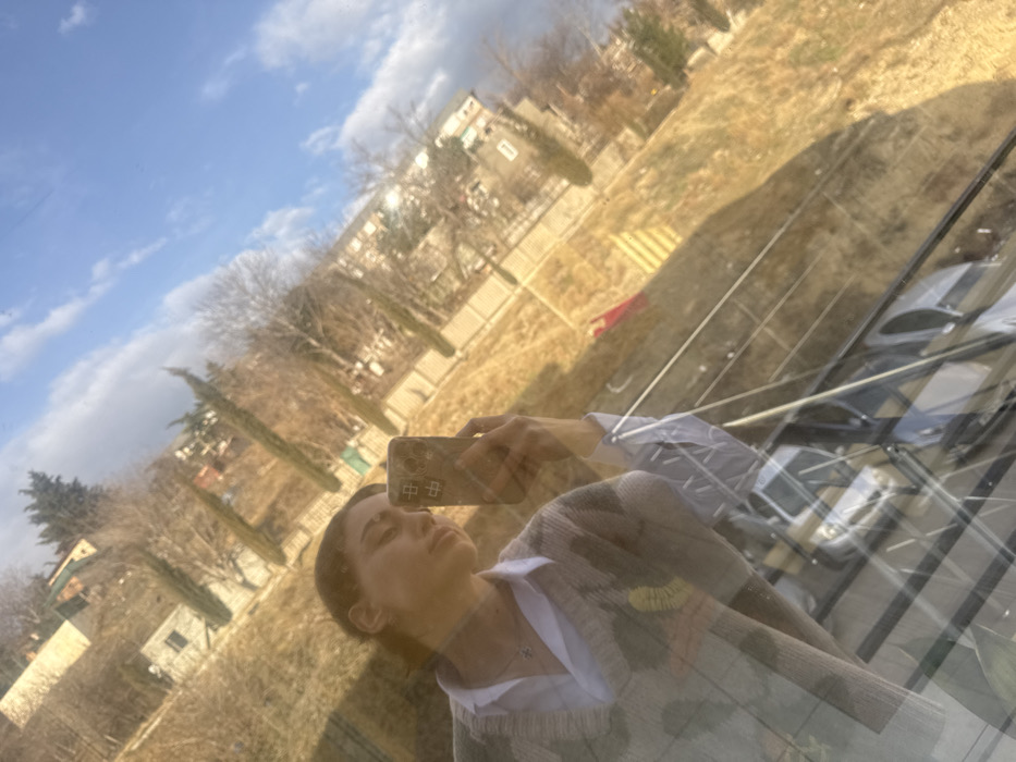 A female individual is captured in a diagonal reflection, appearing to take a selfie with a dark-colored smartphone held in her right hand. She wears a white collared shirt beneath a grey V-neck sweater featuring a subtle pattern and a small yellow emblem on the left side. A silver necklace with a small pendant is visible. Her eyes appear closed or downcast. The reflected background depicts an outdoor urban landscape located in Tbilisi, Georgia. The scene includes a sloping hillside covered in dry, golden-brown grass with numerous bare deciduous trees and several tall, slender evergreen trees. Residential buildings of various sizes are scattered across the hillside and in the distance. A light-colored fence or wall runs horizontally across the mid-ground. On the dry slope, a red rectangular object and a yellow object with horizontal stripes are visible. The sky is clear blue with scattered white cumulus clouds. In the lower portion of the reflection, a grey vehicle and dark metal railings, possibly part of a balcony or window frame, are faintly discernible.