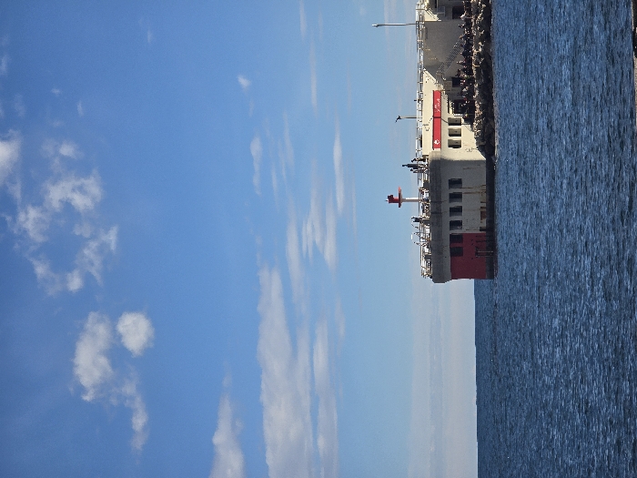 The image displays a daytime coastal scene in Monaco, Monaco, featuring the Larvotto Solarium structure against a clear blue sky with scattered white clouds. The Mediterranean Sea, dark blue and subtly rippled, occupies the lower frame. The multi-level concrete structure, situated in the midground extending from the right, presents a distinctive red-painted lower facade with several rectangular windows facing the sea. The upper levels are light grey or white, capped by a flat deck equipped with railings. A prominent red-and-white striped pole crowned with a red finial stands on the upper deck, alongside a thinner pole to its right. Multiple individuals are visible on the upper deck and congregated on the rocky foundation adjacent to the structure, suggesting recreational activity at this location off Larvotto Beach.