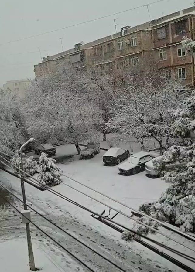 winter scene in what appears to be a residential area. A multi-story apartment building with numerous windows is visible in the background. Several trees covered in snow surround a small parking area with multiple cars also covered in snow. Snow is actively falling, obscuring the view somewhat. A street runs along the bottom of the frame, also covered in snow. Power lines and a streetlamp are visible along the street. The overall color palette is muted due to the snow and overcast sky.