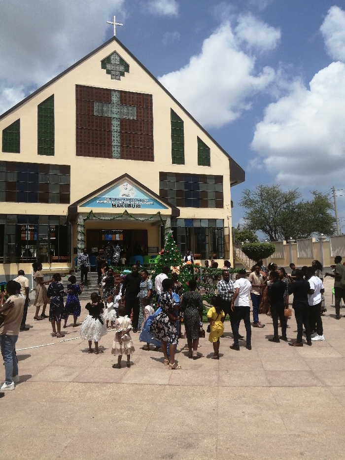 A church with a beige exterior and a cross atop the roof is the focal point. A stained glass cross adorns the front façade. A sign with the word "MAKUBURI" is visible above the entrance. A decorated Christmas tree stands in front of the church. A diverse crowd of people, dressed in various styles and colors, is gathered in the open space before the building. The sky is partially cloudy, suggesting a sunny day.