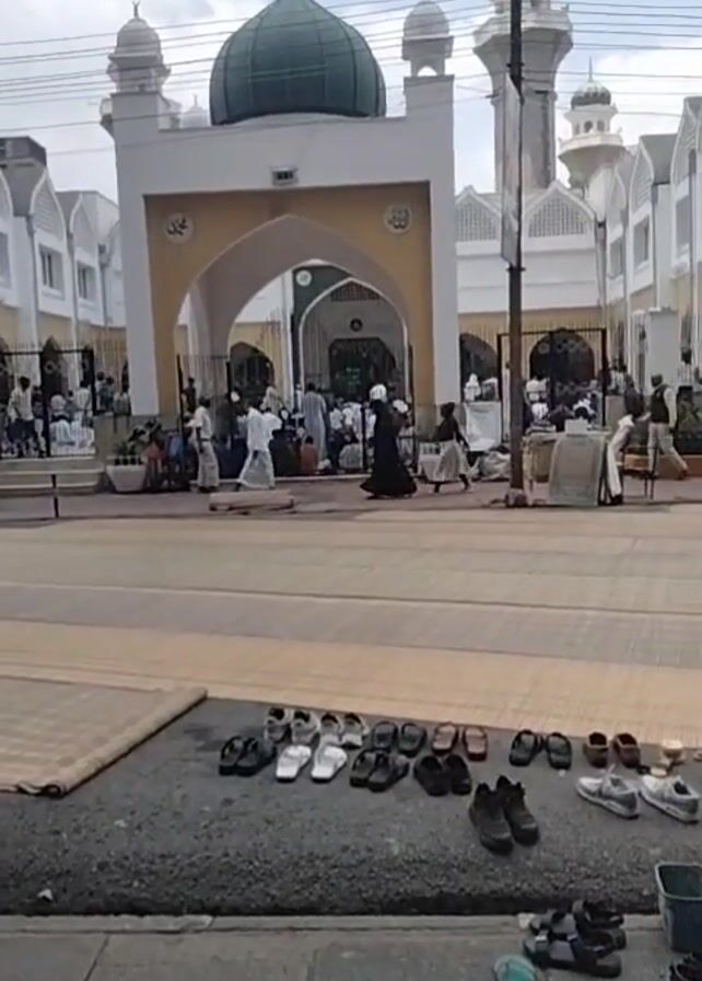 wide shot of a mosque with a green dome and white exterior. In front of the mosque is a large open area with mats laid out on the ground. People are walking around, some entering the mosque and others standing near the entrance. Shoes and sandals are lined up neatly on the sidewalk in the foreground. The sky is overcast. A few people are visible on the left side of the frame, and at one point, a young boy walks into the frame and looks toward the mosque.