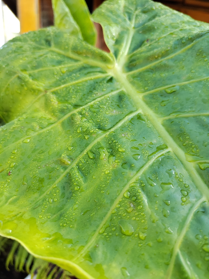 - "A close-up, high-angle shot depicts the adaxial surface of a large, green plant leaf, extensively covered in spherical water droplets" by FM-WroXJ3, licensed under CC BY 4.0