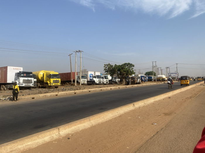 The image depicts a roadside scene in Sabon Gari Nassarawa, Nigeria, under clear daylight conditions