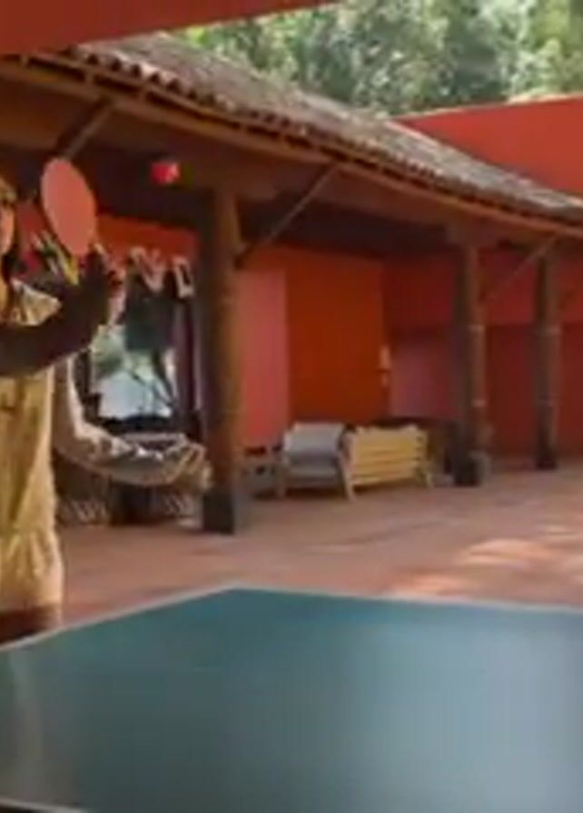 n outdoor ping pong match in progress. The camera's point of view is looking across the table. An orange ping pong ball is being hit back and forth. A woman is playing. The playing area is a tiled patio with a large orange building in the background and a covered area to the left, with wooden posts, a thatched roof, and seating. There are trees in the background. The flooring below the table is tiled, and there are some twigs and leaves on the ground.