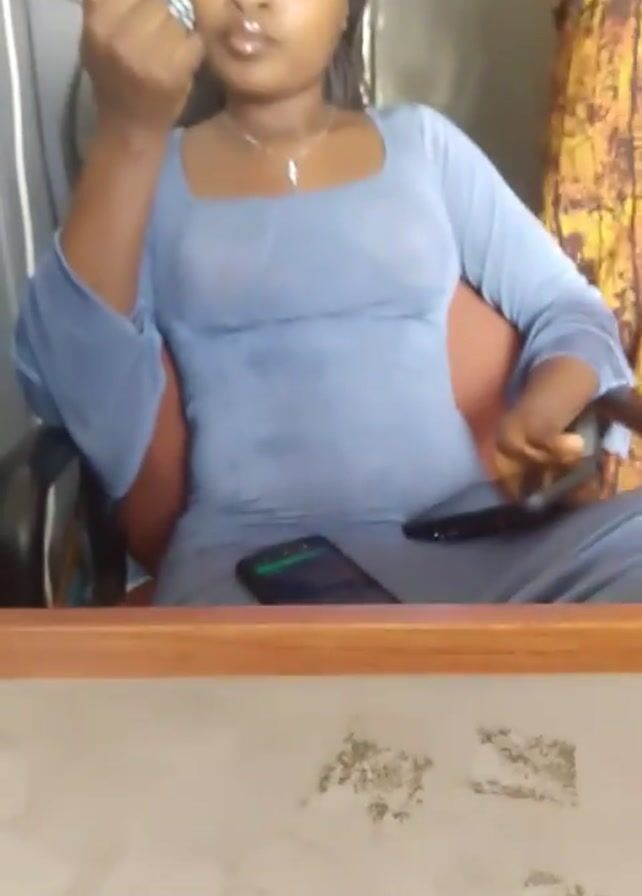 A person sitting in a chair behind a desk is holding a phone in their right hand. There is another phone on the desk. The person has dark hair and dark skin and is wearing a light blue dress with long sleeves. The desk appears to be cream and brown with some marks on the surface. There is a fan in the background. The person touches their head and appears to be waiting.
