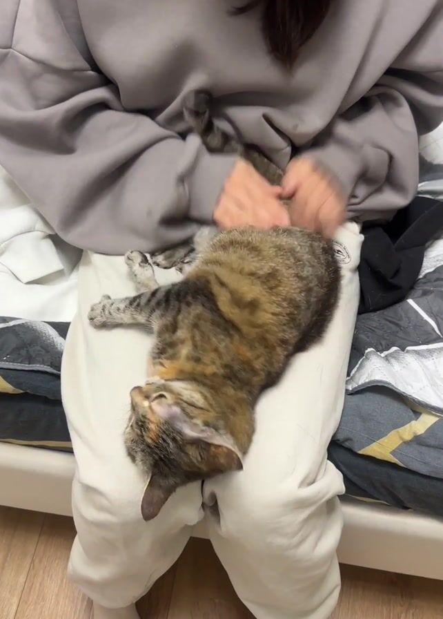 woman sitting cross-legged on a bed, petting a tabby cat lying on her lap. The woman is wearing a gray hoodie and light-colored sweatpants. She has dark hair and is smiling as she pets the cat's back. The cat is lying on its side, seemingly relaxed. The bed has a geometric-patterned comforter and is situated in a room with wooden floors. White curtains hang near a window in the background.