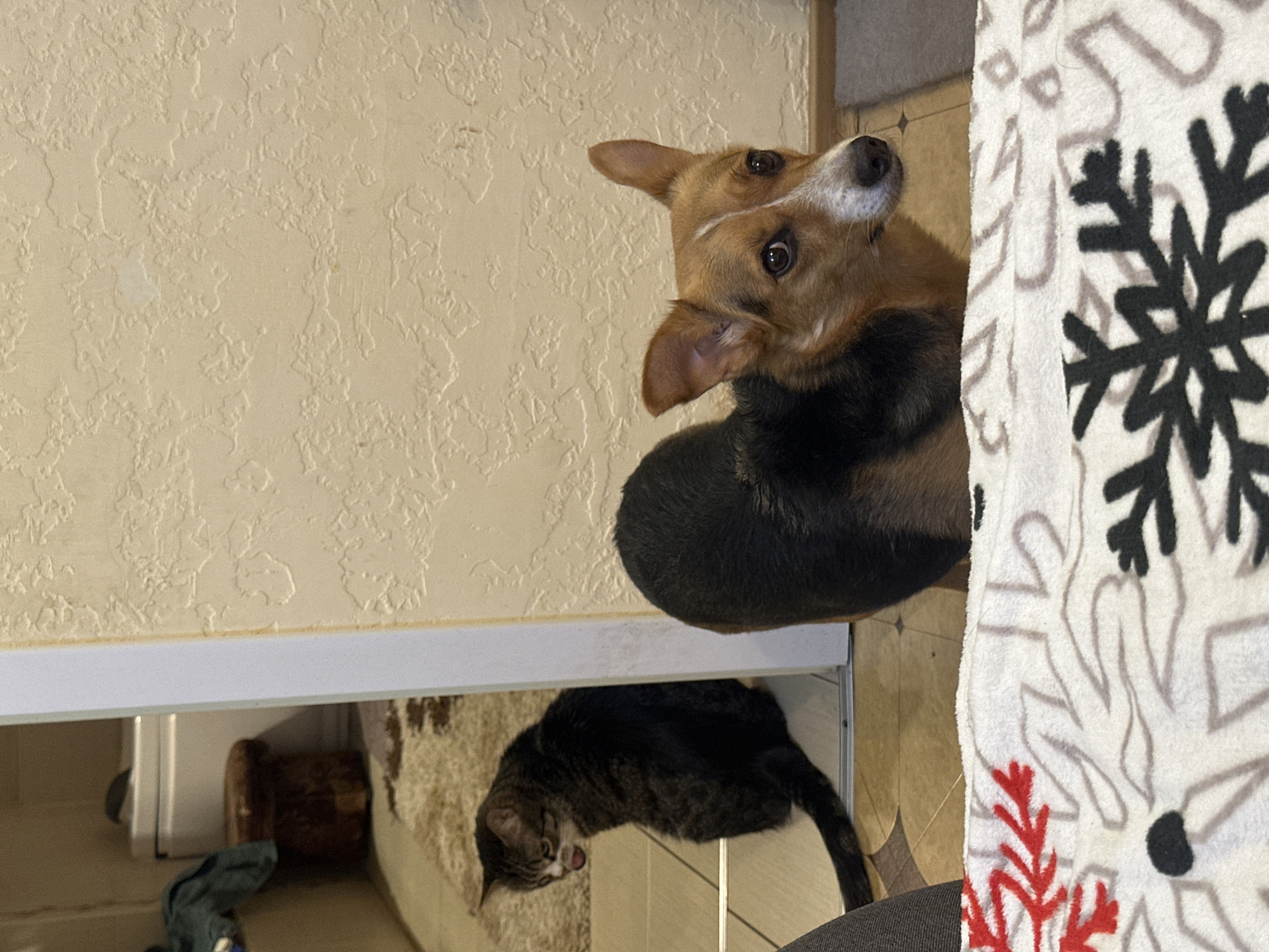 An indoor scene depicts two domestic animals in a residential setting