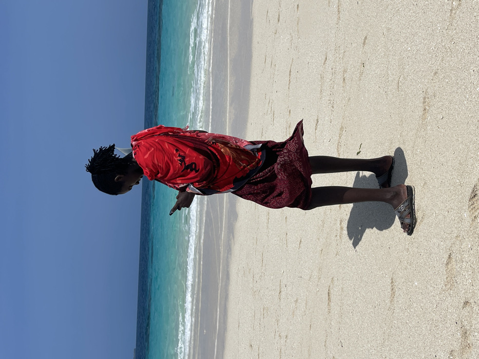 The image depicts an individual standing on a sandy beach in Zanzibar, Tanzania, facing slightly left of the camera's perspective