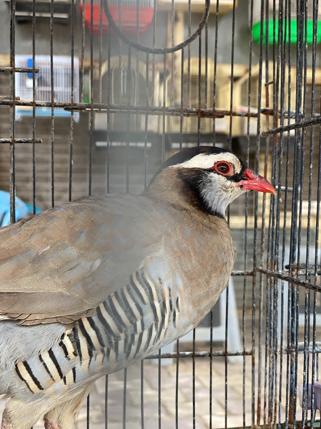 A Chukar partridge (Alectoris chukar) is depicted in close-up, in profile, facing right, contained within a dark, possibly rusted, metal wire cage in the city of Kandahar, Afghanistan. The bird exhibits reddish-brown upper plumage, a greyish breast, and prominent black and white stripes on its flanks. A distinct black band extends from its forehead through its eye and down its neck, outlining a white throat patch. It possesses a bright red orbital ring, a red beak, and partially visible red legs. The background, out of focus, reveals additional wire bird cages of various sizes and colors, including a small white cage with blue accents, a red cage, and a green feeder component, consistent with a bird market or pet shop environment. The distant ground appears to be a light-colored paved or tiled surface. No human subjects are present in the frame.