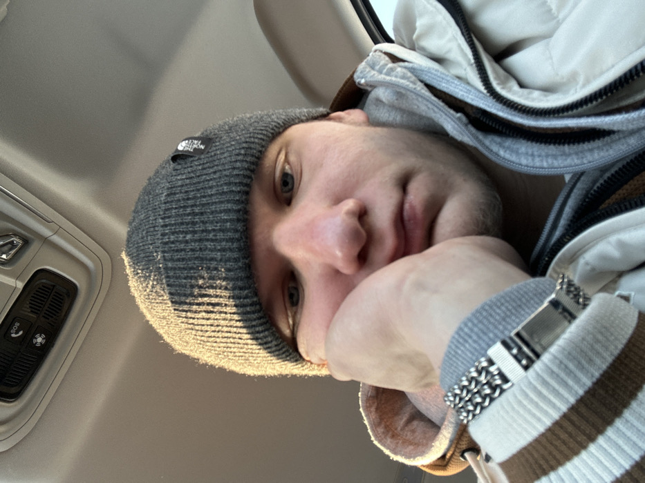A male individual is depicted in a close-up selfie taken inside what appears to be a vehicle
