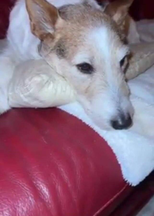 A dog with white and brown fur is resting on a red leather couch. The dog is lying on a white, fluffy blanket and has its head resting on what appears to be a pillow or rolled-up blanket. The dog initially has its eyes closed, but then opens its eyes slightly and looks around before closing them again. The background is out of focus, but the scene seems to be indoors.
