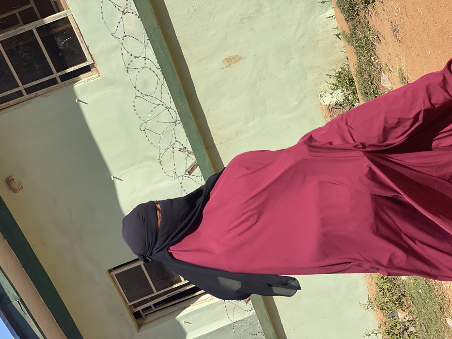 An individual is depicted outdoors in Unguwar Gabas, Nigeria, standing on reddish-brown dirt terrain under bright sunlight. The person is dressed in a black niqab, revealing only the eyes, and a flowing, dark red (maroon) abaya, facing slightly to the viewer's left. In the background, a building with a light green (pale olive) exterior wall is visible. The wall features two windows; the window on the left has an open or missing pane, while the window on the right exhibits a grid-patterned frame. A length of coiled razor wire is affixed horizontally to the building wall, situated below the right window and extending leftward. Sparse green vegetation and minimal white plastic debris are scattered on the ground at the base of the wall.