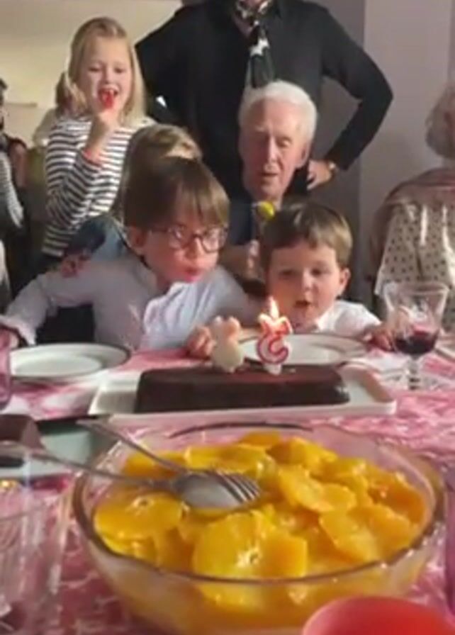 In a warm indoor setting, a group of people are gathered around a table for a birthday celebration. Two young boys with neatly combed hair, one wearing glasses, are in the foreground, blowing out candles on a chocolate cake with a number "5" candle. A bowl of sliced oranges sits prominently in front of them. Behind the children, an older man and woman are observing the scene. Additional children are visible on the left, one with a lollipop. The table is covered with a patterned tablecloth, and various dishes, glasses, and cutlery are arranged around the cake. A mirror is reflecting additional party guests. The atmosphere appears festive and jovial.