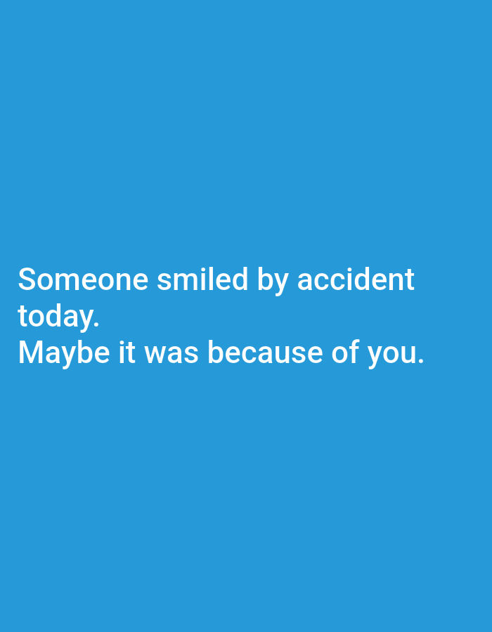 Against a solid blue background, the text "Someone smiled by accident today. Maybe it was because of you." is centered. The text is written in white. The font is simple, sans-serif, and easy to read. The message conveys a sense of optimism and suggests the reader might have unintentionally brightened someone's day.