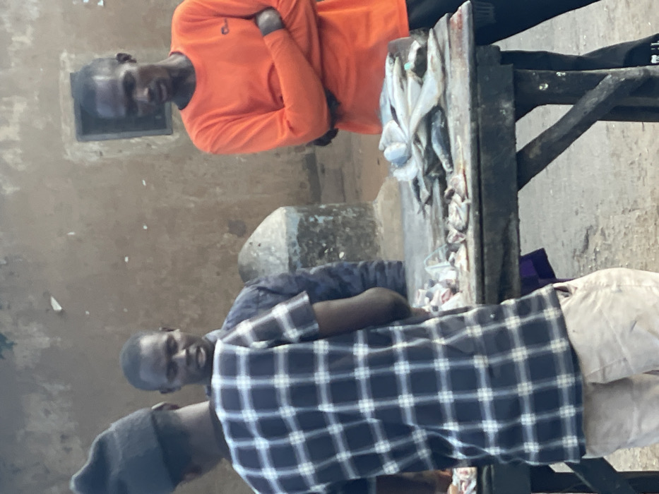 This image depicts three adult males at a fish market stall in Jos, Nigeria