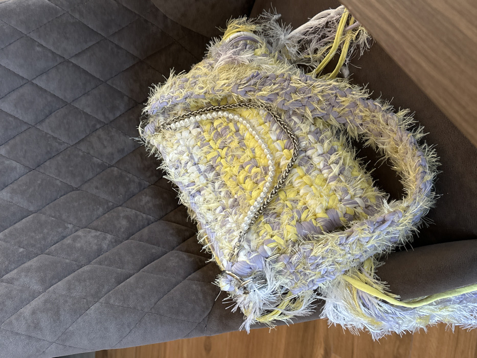 A handcrafted handbag rests on a dark gray upholstered chair. The handbag features a shaggy, textured surface composed of interwoven light yellow and lavender fabric strips or yarn, creating a fringed appearance. A decorative element consisting of a double string of white pearls intertwined with a silver-toned chain is draped across the bag's flap closure. A braided handle, crafted from the same textured material, is visible on the front of the bag, and a plain yellow strap extends from its left side. The chair behind the bag is upholstered in a soft fabric with a prominent diamond-quilted pattern. A dark brown, polished wooden surface is visible in the lower right corner of the frame. No visual information within the image provides identifiable features or landmarks to confirm its location in the city of Virpazar, Montenegro.