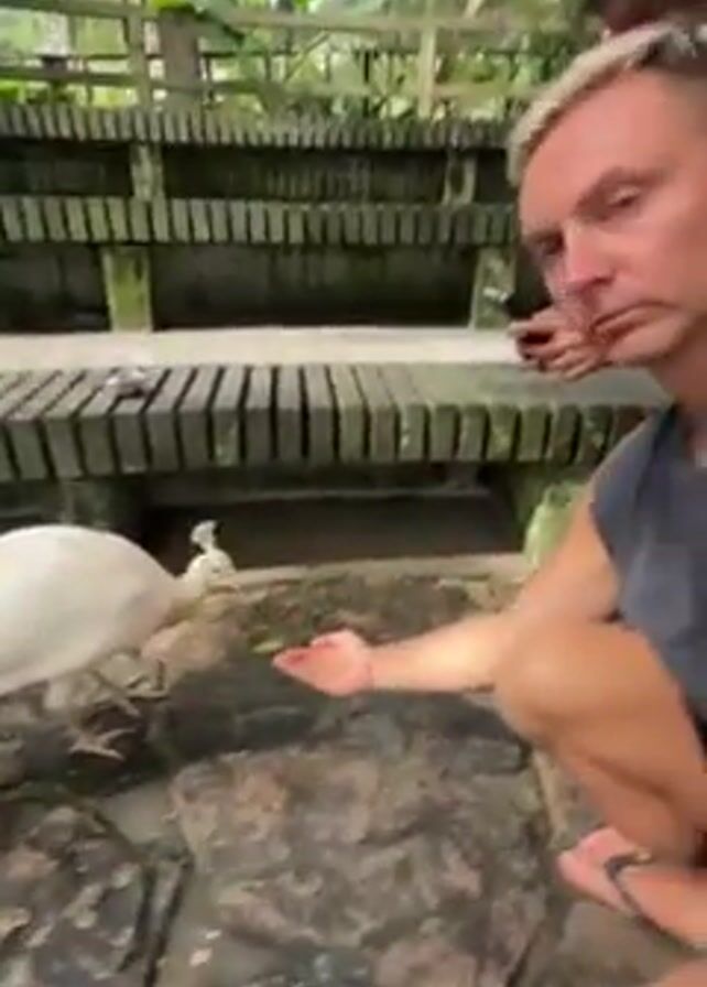 Here's a detailed description of the video: A man is crouched down feeding a white peacock from his hand