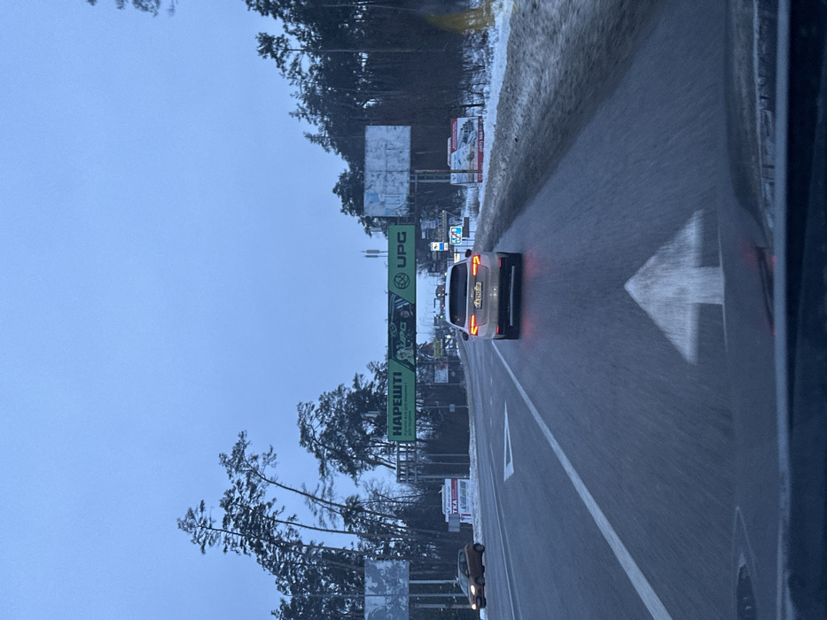 A white car drives on a wet, dark road. A white arrow marking is on the right lane. The car behind has its headlights on. The road is surrounded by trees. The sky is cloudy and there's snow on the shoulder of the road. Large billboard signs are on the side of the road, one showing a UPG logo and "НАРЕШТІ" written on it.