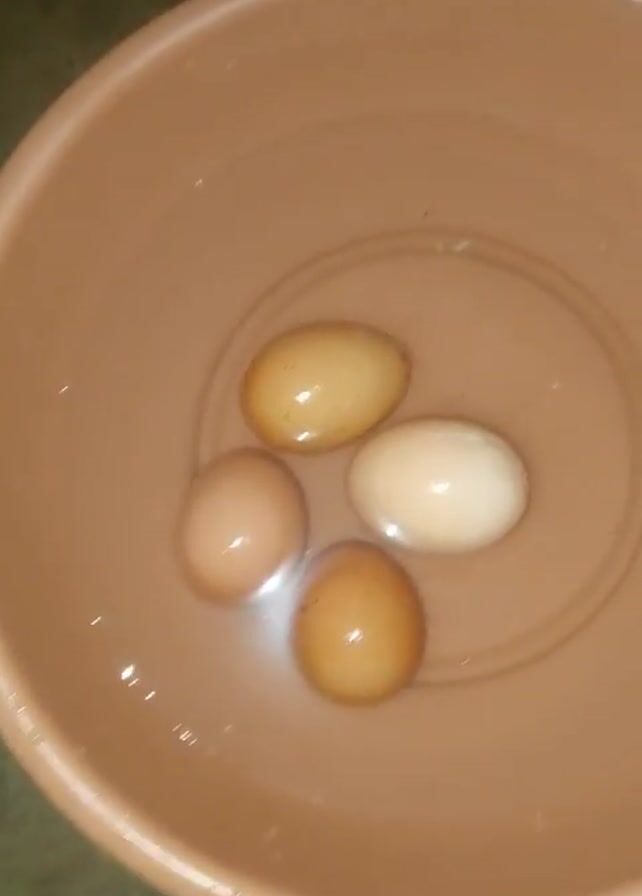 brown plastic bowl containing four eggs submerged in water. The eggs are of varying shades, ranging from light brown to white. The background is blurry and appears to be a green surface.