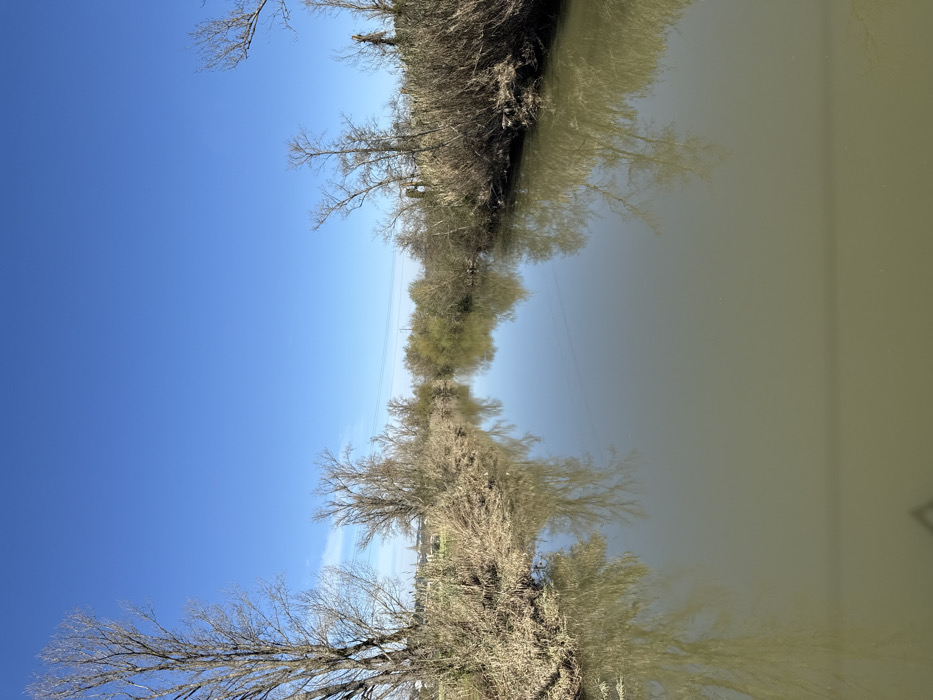 The image presents a longitudinal view of a calm, brownish-green river or canal, likely the Nabão River, situated within the city of Tomar, Portugal. The water surface reflects the clear, bright blue sky that dominates the upper two-thirds of the frame, and also mirrors the dense riparian vegetation lining both banks. The left bank is heavily vegetated with bare deciduous trees and dry, reedy brush. In the middle distance, partially obscured by the foreground vegetation, a light-colored building featuring a distinct spire or tower is visible against the sky; this architectural element is consistent with structures found in central Tomar, such as the Convent of Christ. The right bank exhibits similar vegetation, comprising bare deciduous trees and dense, dry, light-brown brush. A series of utility wires are visible horizontally across the mid-ground sky, passing above the right bank's vegetation. A thin, dark horizontal line, possibly part of a railing or infrastructure, traverses the lower portion of the image, just above or at the water's surface. No human or animal subjects are present in the scene. The environment appears natural and largely undisturbed by immediate human activity, illuminated under a clear sky.