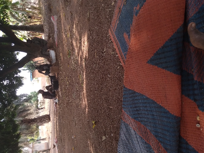 A rural outdoor scene displays a group of people gathered under a tree. The ground is brown and appears to be dirt or gravel. A blue and orange zigzag patterned mat is visible in the foreground, partially covering the ground. In the background, more trees and a small building are present. One foot is present on the rug. The scene gives off a sense of community gathering and a natural, simple environment.