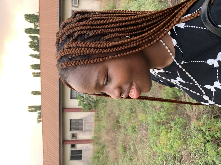 A young woman with brown braided hair smiles softly, eyes closed, standing outdoors