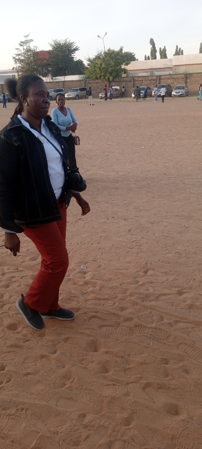 A woman with dark hair wears a black jacket, white shirt, and red pants while walking on a sandy ground