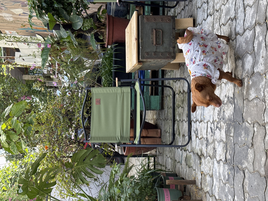 A brown dog wearing a white dress with a mushroom pattern lays on a patterned gray tile patio. The patio is surrounded by lush plants and flowers in pots. A green folding chair sits nearby, as does a wooden box and a planter. The scene is filled with foliage, creating a vibrant and natural ambiance.