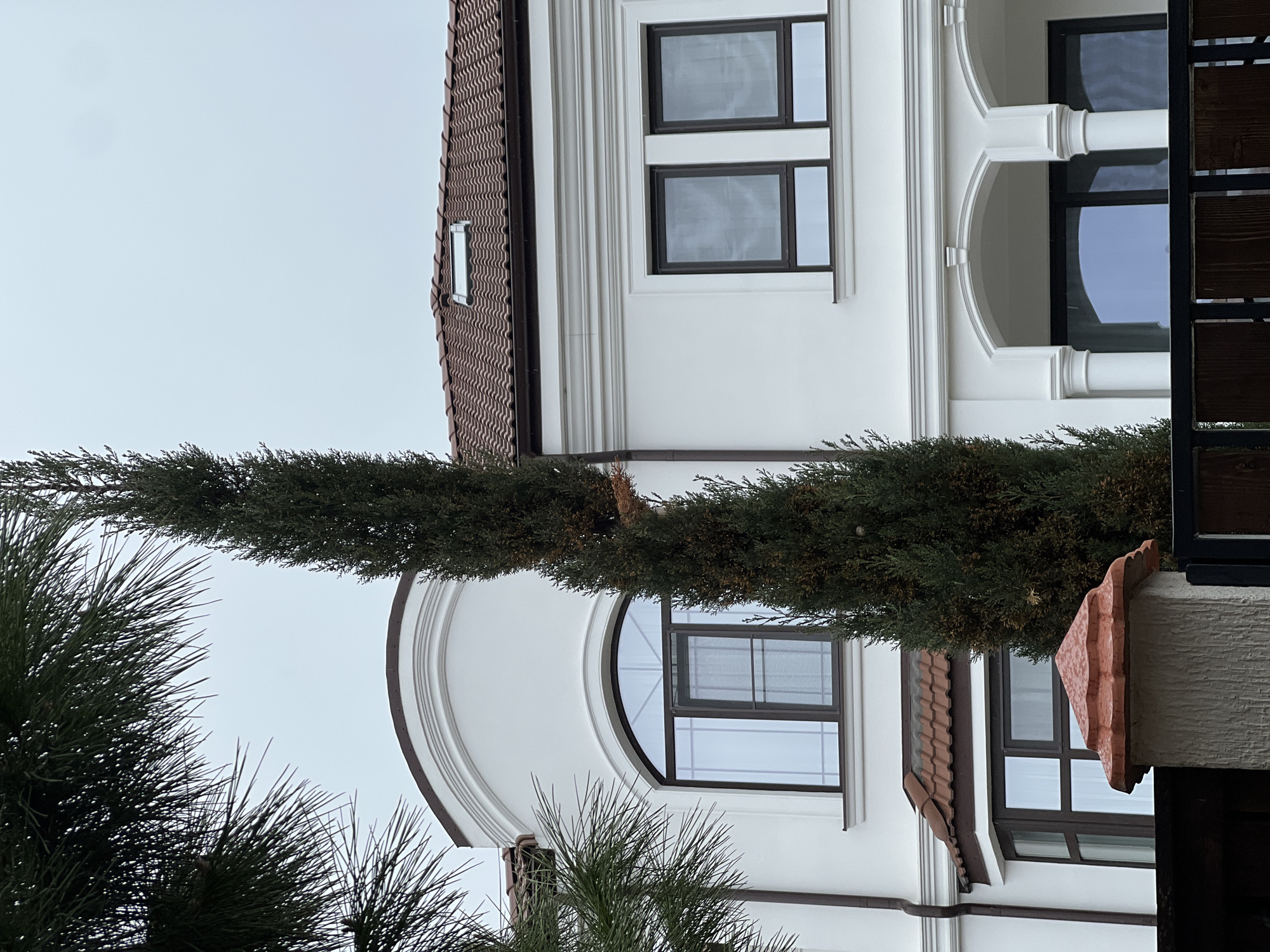 A low-angle shot reveals a section of a white building in Gelendzhik, Russia, with dark-framed windows, white columns, and a brown roof