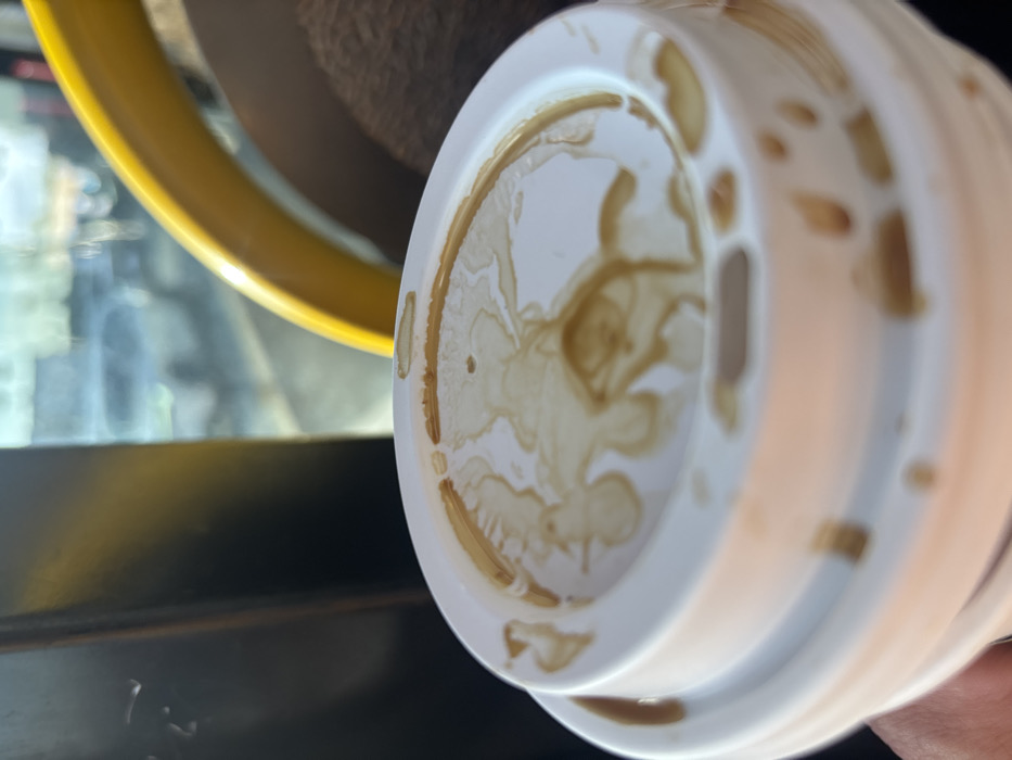 The image depicts a close-up, slightly overhead view of a white disposable coffee cup with a stained lid, held by an individual's hand. The setting is identified as an urban environment within Los Angeles, United States of America, viewed from an interior space. The primary subject is a circular white plastic lid, heavily marked with dried, light brown liquid stains, consistent with spilled coffee or a similar beverage. The stains cover both the flat top surface and the raised sides of the lid, with numerous drips and streaks visible. A small, dark circular opening, likely a drinking spout, is present on the lid but obscured by stains. A human hand, visible in the lower-left foreground, holds the cup from below. A portion of a thumb and index finger, with light to medium skin tone, are discernible. The background is divided into interior and exterior elements. To the immediate left of the cup, a dark, reflective vertical surface, possibly a window frame or structural element, is present. To the right, a curved, bright yellow, glossy handrail or support structure is prominent. Below and to the right of this yellow element, a dark brown, textured surface, possibly fabric upholstery or a bag, is partially visible. Beyond these interior components, a window reveals a blurred exterior scene under bright daylight conditions. Multiple light-colored vehicles, consistent with cars, are visible in the distance, suggesting a street or highway. The overall impression is one of being inside a vehicle or building, overlooking a bustling urban street in Los Angeles.