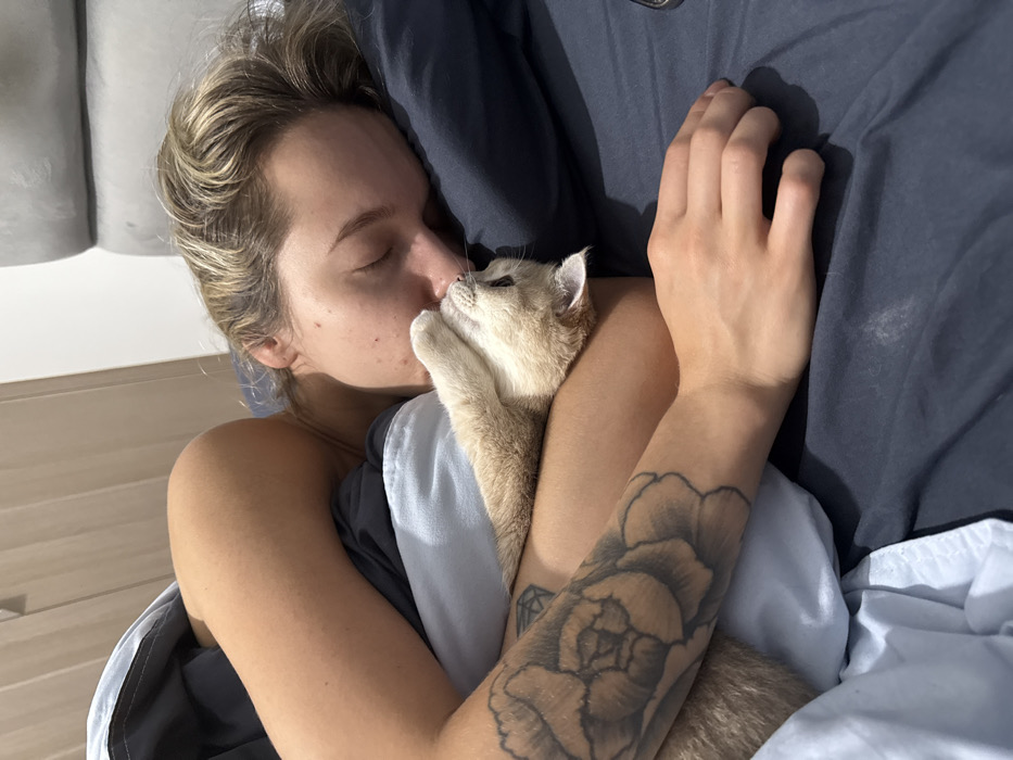 A fair-skinned individual with blonde hair is observed sleeping on their right side in a bed in the city of Ajman, United Arab Emirates. Their eyes are closed, and their head rests on a dark blue pillow. A light-colored cat, appearing cream or light brown, is nestled against the individual's face, with its front paws positioned near the individual's nose and mouth. The cat's eyes are partially closed. The individual's left arm is visible, revealing a prominent, detailed floral tattoo on the upper arm. The individual is partially covered by dark blue bedding, beneath which a lighter blue or white sheet is visible, providing a surface for the cat. A light-colored wall with grey upholstered paneling forms the background. A metallic object, possibly a mobile phone or remote, is partially visible on the dark blue bedding to the right of the individual's right hand. The scene depicts a close interaction between the sleeping individual and the cat.