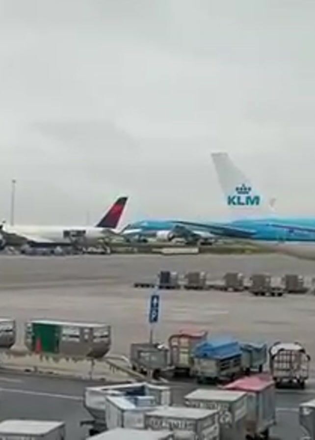 n airport tarmac on an overcast day. Several airplanes are visible, including a Delta plane, a KLM plane, and what appears to be another KLM plane partially obstructed behind them. The planes are stationary. Numerous cargo carts and a parking sign are positioned in the foreground. The ground appears to be paved.