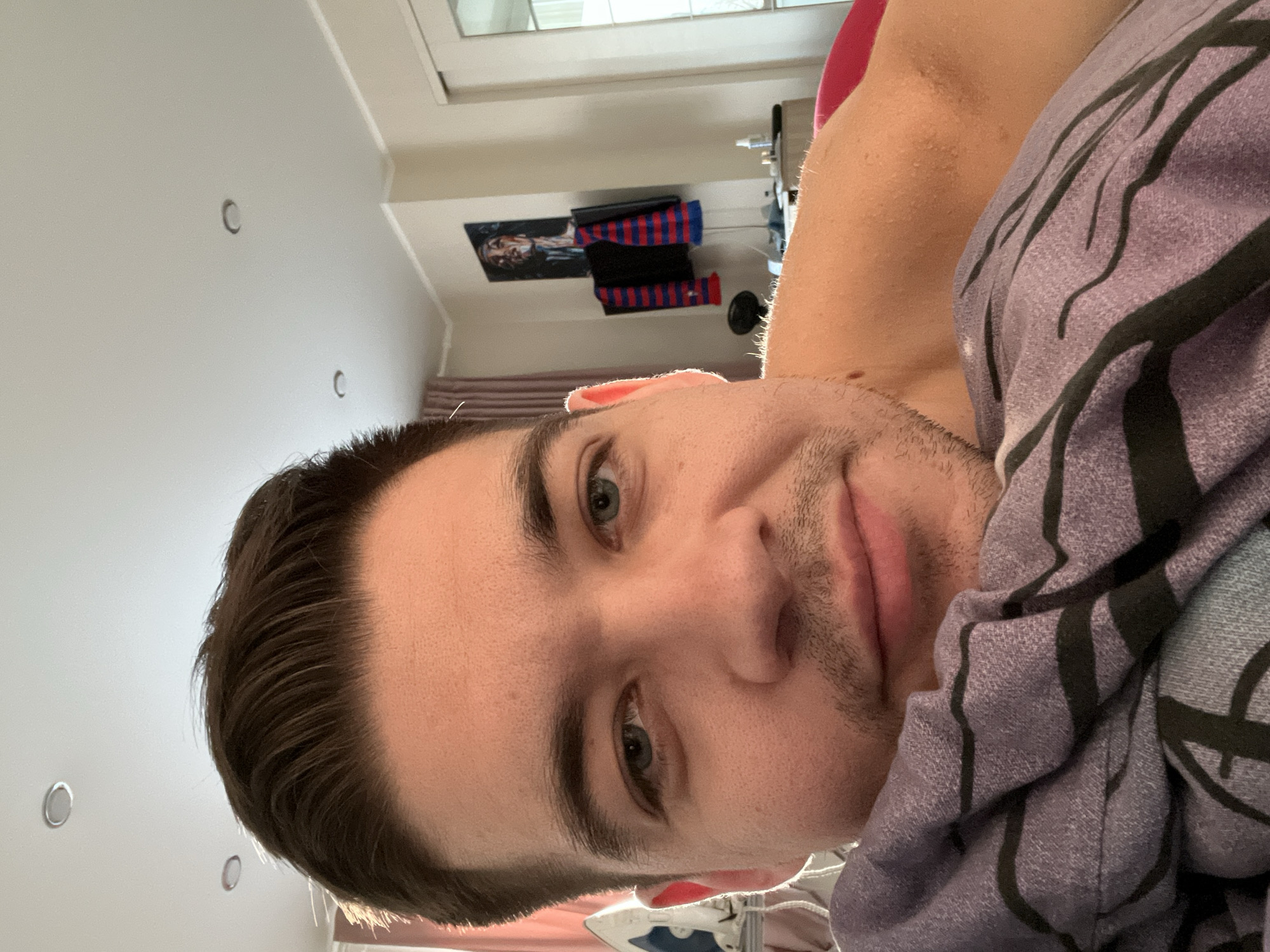- "A man with short, dark hair and blue eyes is lying down, partially covered by a purple and black patterned fabric" by FM-9YGJx2, licensed under CC BY 4.0