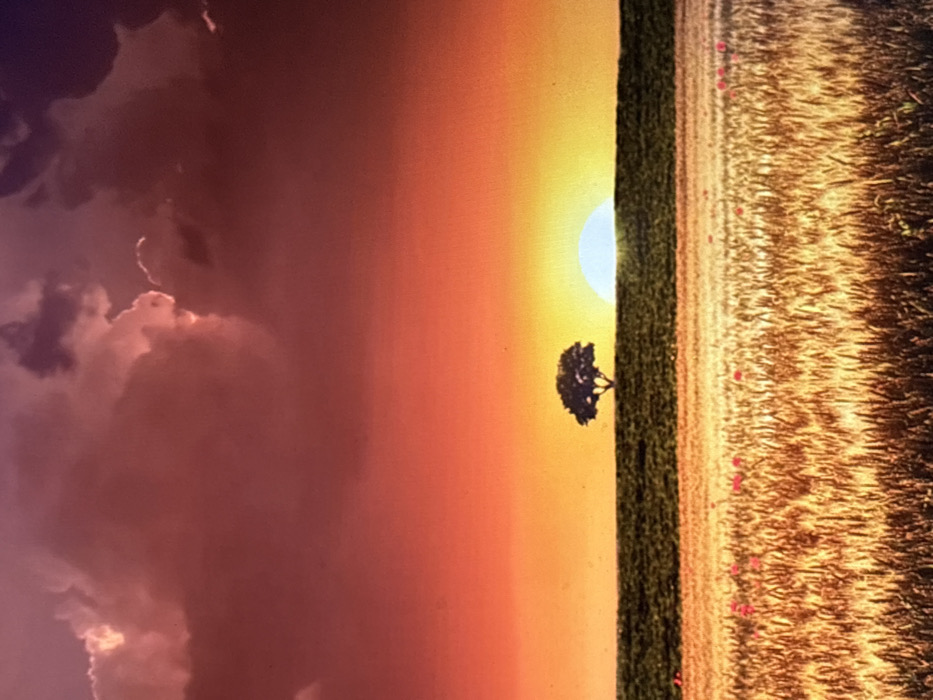 A single tree stands silhouetted against a setting sun. The horizon divides the image, with a field of golden wheat to the right, punctuated by small red flowers. The sky transitions from vibrant orange near the sun to a mix of purple and pink on the left, marked by scattered clouds.