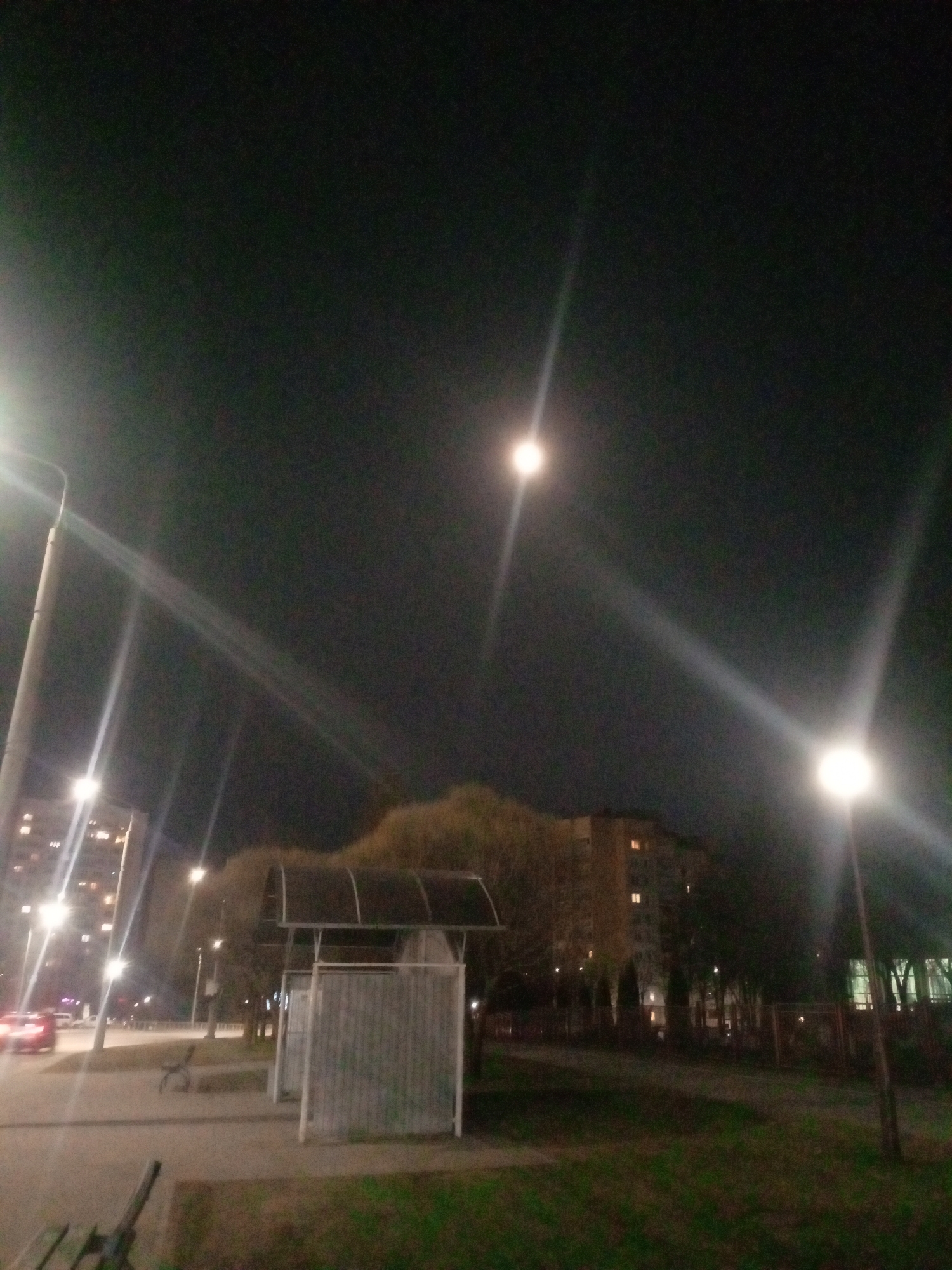 Here is a description of the image: The image shows a nighttime urban scene in Unknown, Unknown. There is a grassy area on the right side of the frame. A sidewalk runs along the left side. A bus stop structure stands near the sidewalk, with a bench visible nearby. In the background, there are several buildings and trees. Streetlights illuminate the area. There are lights from the buildings in the background as well as a red car on the left side of the image. A bright light source, possibly the moon, is visible in the sky.