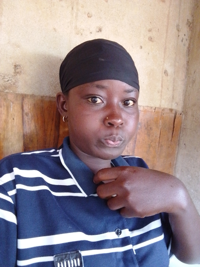 An individual with dark skin, wearing a black head covering and a dark blue collared shirt with white horizontal stripes, is depicted in a medium close-up. They have small gold-colored hoop earrings in both ears and a light-colored stud in their right nostril. Their lips are slightly pursed, and they are looking directly at the camera. The individual's right hand is positioned at the collar of their shirt. The background consists of a light brown, textured wall, partially obscured on the left by vertical wooden planks, possibly part of furniture or interior paneling. The scene takes place in Vodni, Nigeria.