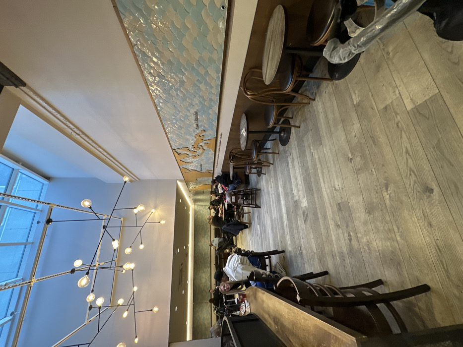 The image depicts the interior of a Starbucks coffee shop located at County Mall Shopping Centre, Unit 10, Crawley, RH10 1FG, United Kingdom. The perspective is from the front of the establishment, looking towards the back and right side. The ceiling is exceptionally high, featuring a large rectangular skylight across the width of the space, admitting natural light. Suspended from the high ceiling is a large, modern, black linear chandelier with multiple globe-shaped light bulbs. The upper walls are painted white, transitioning to a lower section with a prominent, elongated mural. This mural depicts a map of Asia and the Pacific region, outlined in a light brown material, against a background of light blue and cream-colored scale-like tiles, suggesting water. A dark brown dado rail runs along the bottom of the wall beneath the mural. The floor is covered with light-colored, wide-plank wood-effect flooring. On the left side of the image, running along a dark partition, is a long, light brown wooden bar-height counter with two dark wooden bar stools visible in the foreground. A person wearing a white top is seated at this counter, partially obscured. A red coffee cup is visible on the counter. The middle and right sections of the image feature various seating arrangements. Multiple circular wooden-topped tables with dark metal bases are present, accompanied by dark wooden chairs of a bentwood style. Some tables are empty, while others have items such as menus or sugar packets. In the far right foreground, a portion of a light-colored pram or stroller is visible. Towards the back of the establishment, numerous individuals are seated at tables and in booths. Approximately 10-15 people are visible in various states of interaction; some are conversing in groups, others appear to be using personal electronic devices. Seating at the rear includes a mix of chairs and what appear to be fixed booths along the back wall, which is a muted green color. The overall atmosphere appears to be a casual gathering space.