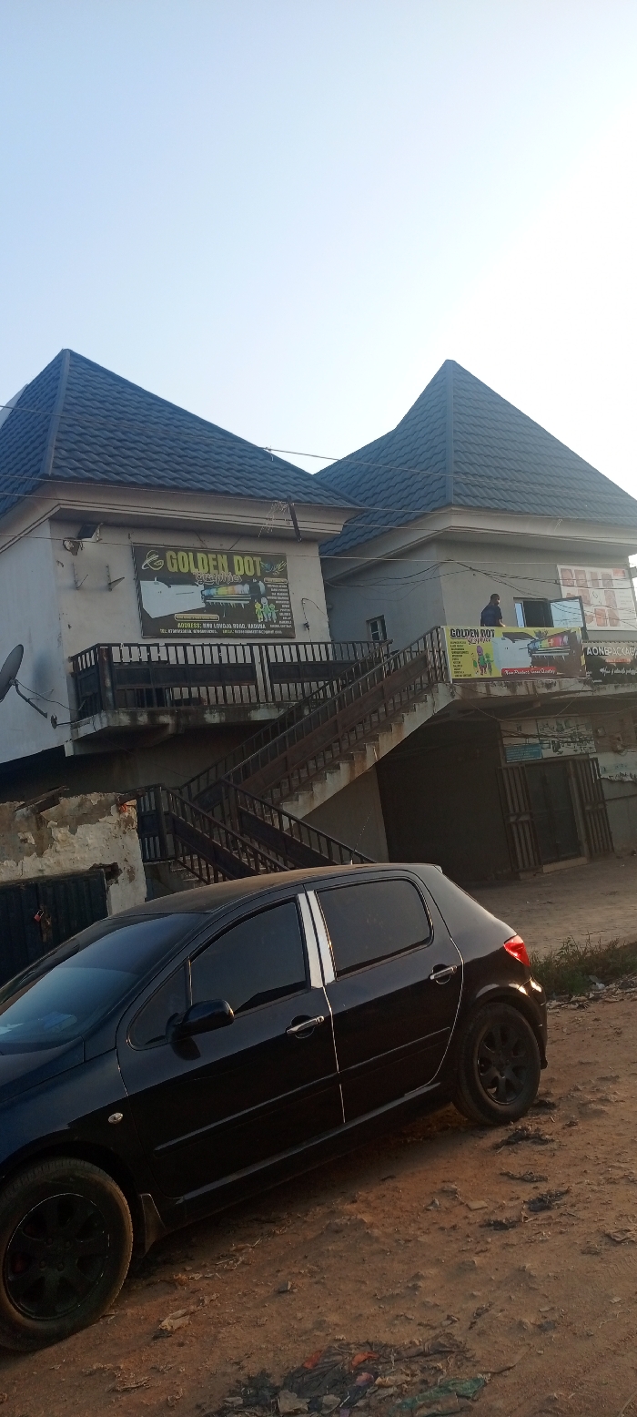 The image displays an urban scene in Dadi Riba, Nigeria. A black, four-door hatchback vehicle, consistent with a Peugeot 307 model, is positioned in the foreground, parked on an unpaved, reddish-brown dirt surface. The vehicle has tinted windows and silver trim around the window frames. Scattered debris and refuse are visible on the ground directly in front of and beneath the car. In the background, a two-story building with light-colored, possibly stuccoed, walls and dark, pyramidal roofs dominates the frame. The upper floor features an exterior balcony with dark metal railings and is accessible via a set of external dark metal stairs. Two large commercial signs are affixed to the upper facade. The sign on the left displays "GOLDEN DOT graphics" with a black background, white and yellow text, and images related to printing, including a partial address indicating "MHW LOKOJA ROAD, KADUNA". A second "GOLDEN DOT" sign, featuring similar branding, is visible on the right side of the upper floor. Adjacent to this, a partially visible sign reads "AONE PACKAGE". A single individual wearing dark clothing is discernible standing on the right-hand portion of the upper balcony. A white satellite dish is mounted on the left side of the building's exterior. The ground floor of the building presents multiple dark, shuttered entrances. The sky overhead is clear and light blue.