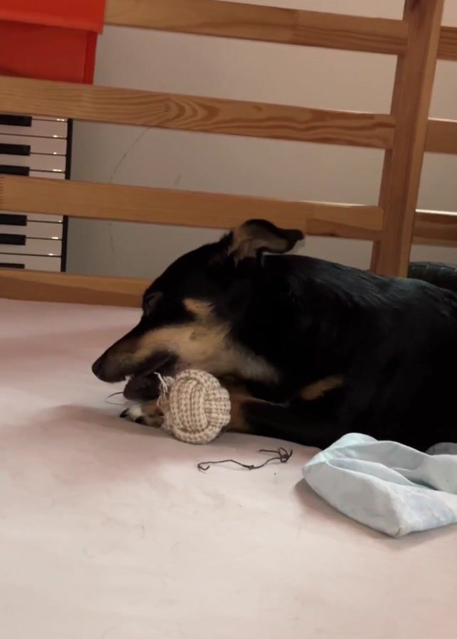 A medium shot depicts a black and brown dog lying on its side on a pink floor, chewing on a small, beige knitted ball