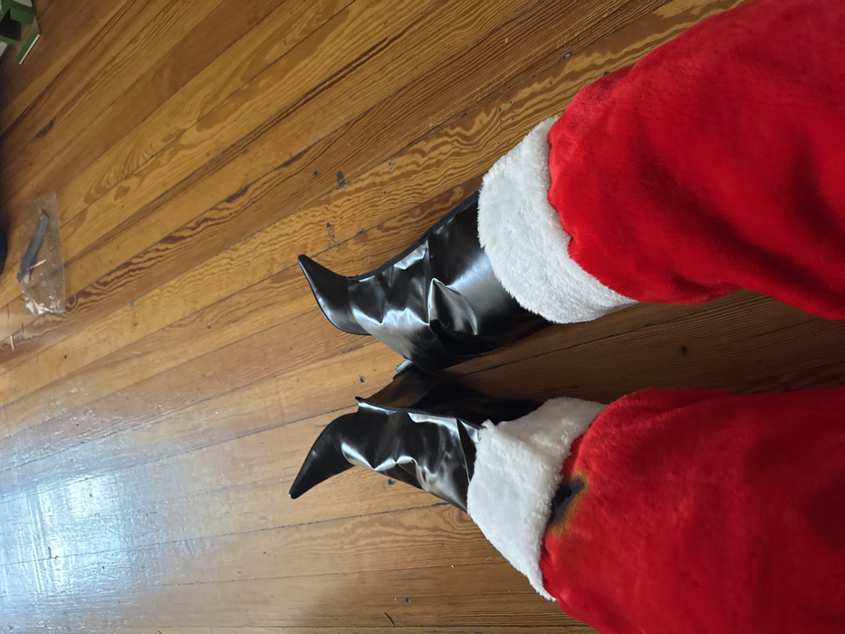 A partial view of a Santa Claus costume lays on a wooden floor. Only the lower portion of the costume is visible, featuring black, pointy-toed boots attached to red pants trimmed with white fur. The wood floor consists of long planks oriented diagonally across the frame. The scene is well-lit and the focus is sharp.