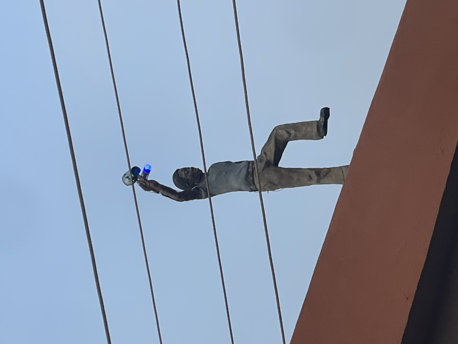 A statue of a man appears to be suspended in mid-air, clutching an illuminated blue object in one hand and a glass globe in the other. The figure, dressed in casual clothing, is positioned against a backdrop of parallel cables. A portion of the bridge structure, colored a reddish-brown, is visible on the right side of the image. The sky above is a pale blue, providing a stark contrast to the statue's darker tones.