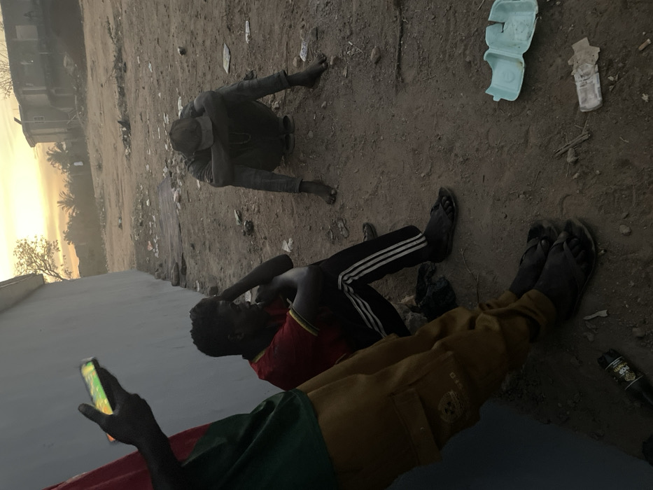 Three people are resting outdoors. One person in dark clothing is seated, hugging their knees. Another is reclining, wearing a red shirt and black pants with white stripes. The third person holds a phone and wears a green shirt and brown pants. The background includes dirt, trash, a wall, and buildings silhouetted against a bright sky.