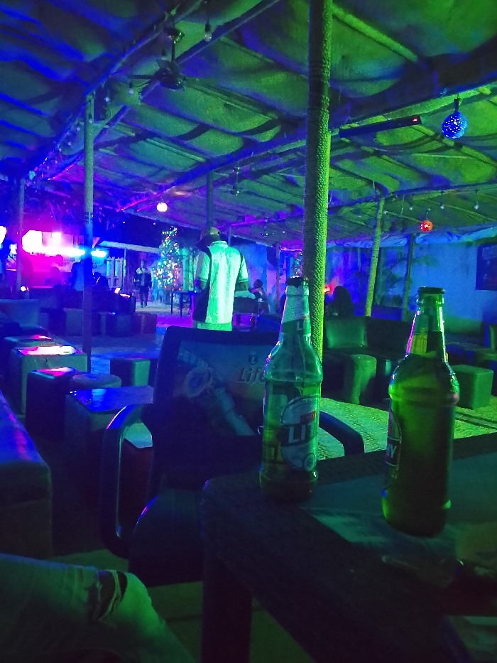 An indoor bar scene shows two beer bottles in the foreground on a small table. Beyond, a man stands with his back to the camera near a lit Christmas tree. Patrons sit on blocky seats in the background. Overhead, the bar has a thatched roof adorned with ceiling fans and colorful decorative lights. The bar is illuminated with green and blue lights, creating a vibrant and festive atmosphere.