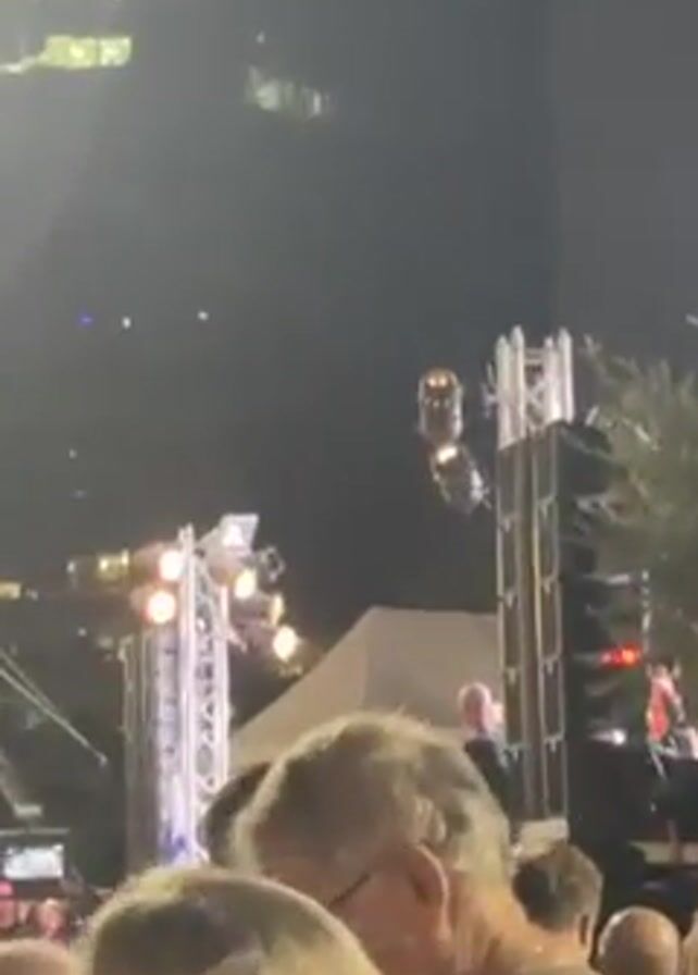 The video depicts a crowd of people at night, with several tall buildings visible in the background
