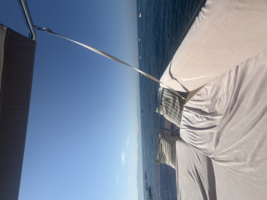 A horizontal composition shows a boat deck with draped white upholstery and patterned pillows, framing a view of calm, blue water and a clear, bright sky. Distant boats dot the water, indicating a coastal scene. A metal support and a white tensioning strap are visible in the upper left, adding to the maritime context. The image captures a serene, sunny day at sea, likely from a leisurely cruise or anchored position.