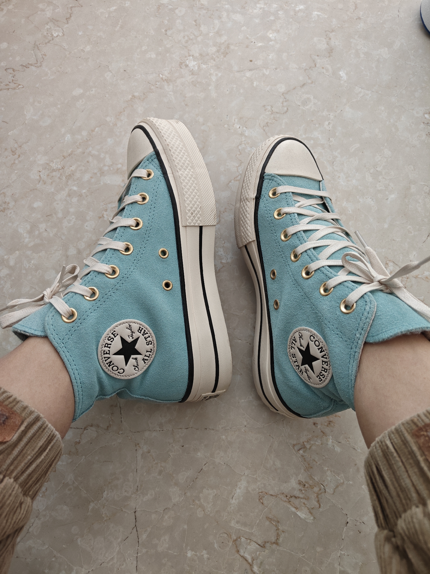 A person is wearing light blue Converse high-top sneakers. The shoes have white laces, gold eyelets, and white rubber soles with black stripes. The person is wearing tan corduroy pants. The background is a beige marble floor. The location is not discernible as Mumbai, India.