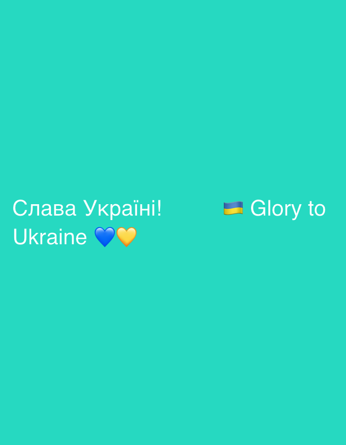 The image displays "Слава Україні! Ukraine" stacked on the left, followed by blue and yellow heart emojis. On the right side, a Ukrainian flag emoji precedes the text "Glory to". The background color is a bright aquamarine. The overall composition conveys support and solidarity with Ukraine, using both Ukrainian and English text.