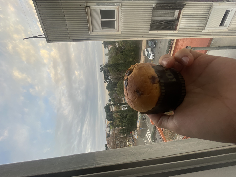 A hand holds a blueberry muffin in front of a window. The view outside shows a coastal city with buildings, trees, and a glimpse of the beach. The sky is overcast, suggesting it might be early morning or late afternoon. The building exterior features corrugated metal and closed window shutters. The muffin is wrapped in a dark brown paper.