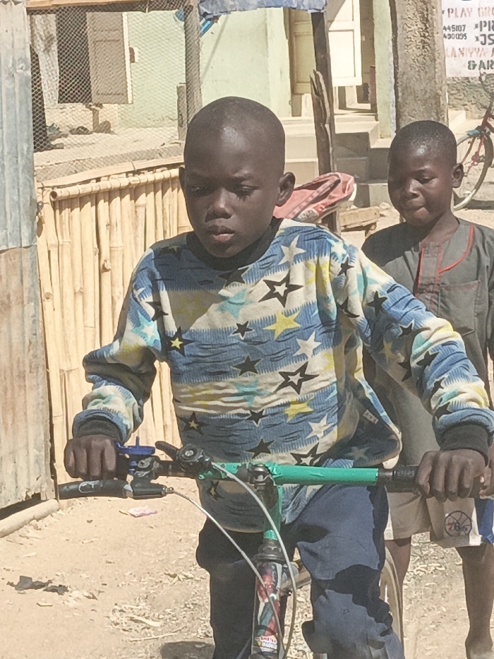 The image portrays two young males outdoors in Hotoro North, Nigeria, under direct sunlight. In the foreground, a child with dark skin and short hair wears a long-sleeved shirt patterned with white, black, and yellow stars on a light blue background, paired with dark blue trousers. He holds the green handlebars of a bicycle, facing forward with a neutral expression. Behind him, a second child, also with dark skin and short hair, wears a grey long-sleeved tunic with red trim and light-colored shorts displaying a partial "76ers" logo; he is partially obscured and looks towards the right. The ground is unpaved, composed of dry, light-brown earth. The background features a horizontal bamboo fence, corrugated metal sheeting to the left, and a light-green building with a door and a metal mesh window. A wooden pole stands vertically, and a partial red bicycle wheel is visible on the far right. A white sign with incomplete text, including "PLAY GROUN" and numerical details, is discernible in the upper right background.